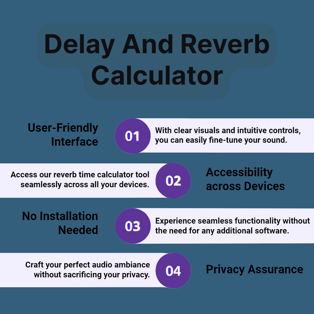 Discover the ultimate Delay and Reverb Calculator for Free! Your privacy is our priority - we never collect user data, ensuring your peace of mind. With our tool, craft your perfect audio ambiance without sacrificing your privacy. Experience precision without compromise. Try it now!