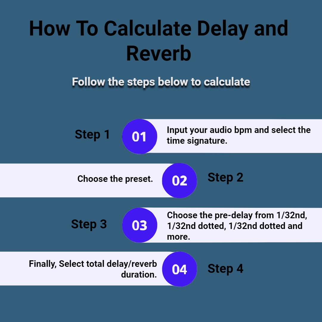 To calculate reverb time, you'll need to follow these steps: Input your bpm: Determine the beats per minute (bpm) of your audio track or the piece you're working on. Select the time signature: Identify the time signature of your music, whether it's in 4/4, 3/4, or another signature. Choose the preset: Decide on the type of reverb preset you want to use, such as hall, plate, room, or chamber. Choose the pre-delay: Select the pre-delay timing from options like 1/32nd note, 1/32nd dotted note, or others, depending on the desired effect and rhythm of your piece. Select total delay/reverb duration: Determine the total duration of the delay and reverb effect you want to apply to your audio. Once you've gathered this information, you can use it to calculate the reverb time based on your preferences and the characteristics of your music.