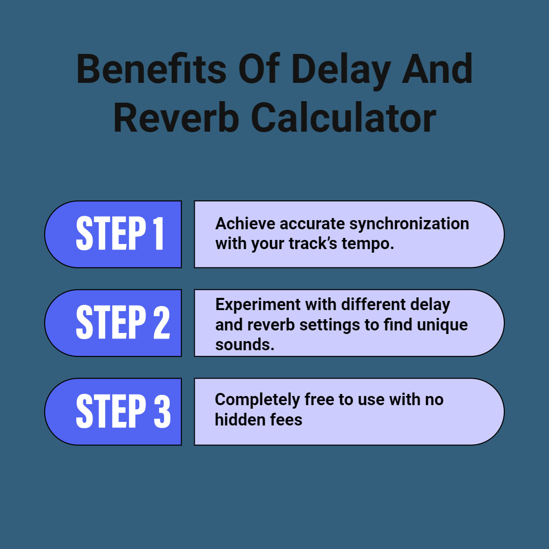 The process is made simpler with our delay & reverb time calculator, which doesn't need creating an account or signing up. Simply enter the requirements to receive instant audio results. You do not need to register in order to use our tool repeatedly.